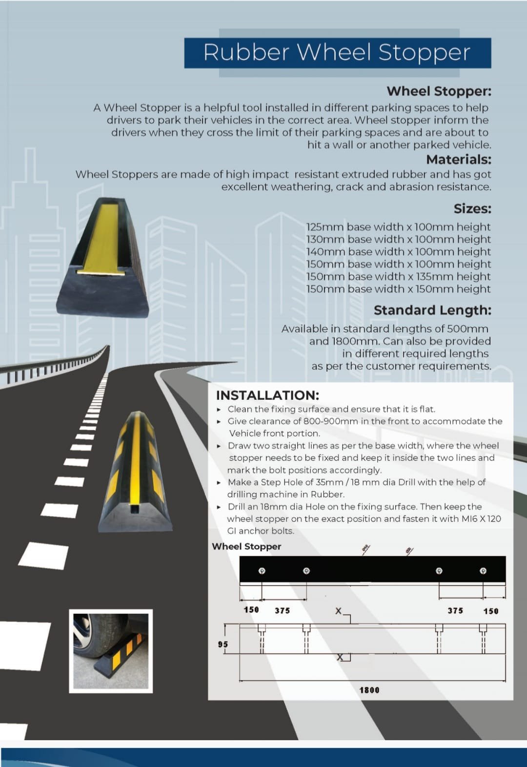 Our rubber and concrete wheel stopper is a robust and dependable solution designed to enhance safety in parking lots and traffic management. Combining the durability of concrete with the impact-absorbing properties of rubber, our wheel stopper effectively prevents vehicles from overstepping boundaries, reducing the risk of accidents and damage. Its easy installation and long-lasting performance make it an ideal choice for ensuring orderly and secure parking environments, reflecting our commitment to safety and quality in every product we offer.